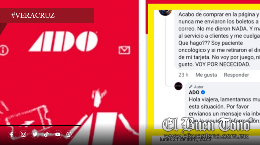 - Facebook oficial de ADO: Decenas de usuarios publican capturas de sus cargos bancarios sin boletos emitidos. Respuestas de la empresa son copiadas y pegadas: “Comuníquese con su banco”.