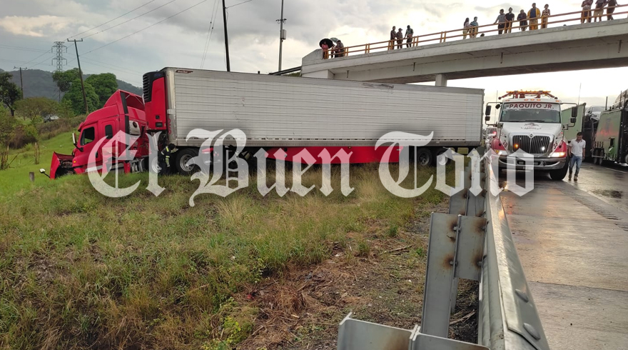 Amatlán.- Un tractocamión tipo caja seca, a punto estuvo de volcar tras chocar contra la barra divisora de los carriles cuando circulaba sobre la autopista México-Veracruz. El percance de registró a la altura del kilómetro 300, luego de que el conductor circulara a exceso de velocidad y por lo mojado del pavimento derrapó, por lo que se impactó con los muros divisores para posteriormente quedar afuera de la carpeta asfáltica. El conductor, al ver lo ocurrido, escapó del lugar con rumbo desconocido. De los hechos tomaron conocimiento elementos de la Guardia Nacional división carreteras.