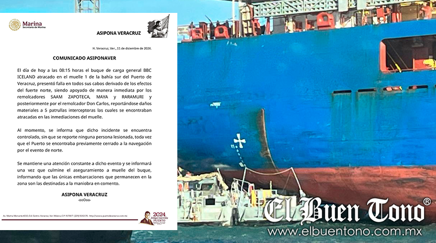 Veracruz, Veracruz. – Un incidente ocurrido esta mañana en el Puerto de Veracruz dejó daños materiales a cinco patrullas interceptoras, tras soltarse el buque de carga BBC ICELAND debido a las fuertes rachas de viento asociadas al evento de Norte. El buque se encontraba atracado en el muelle 1 de la bahía sur cuando presentó fallas en todos sus cabos, lo que ocasionó que se descontrolara temporalmente.
