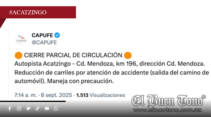 Acatzingo, Pue.- Autoridades de Caminos y Puentes Federales (CAPUFE) reportaron un cierre parcial de la autopista Acatzingo – Ciudad Mendoza, a la altura del kilómetro 196, en dirección a Ciudad Mendoza, debido a un accidente que involucró la salida de un vehículo del camino (10-42).