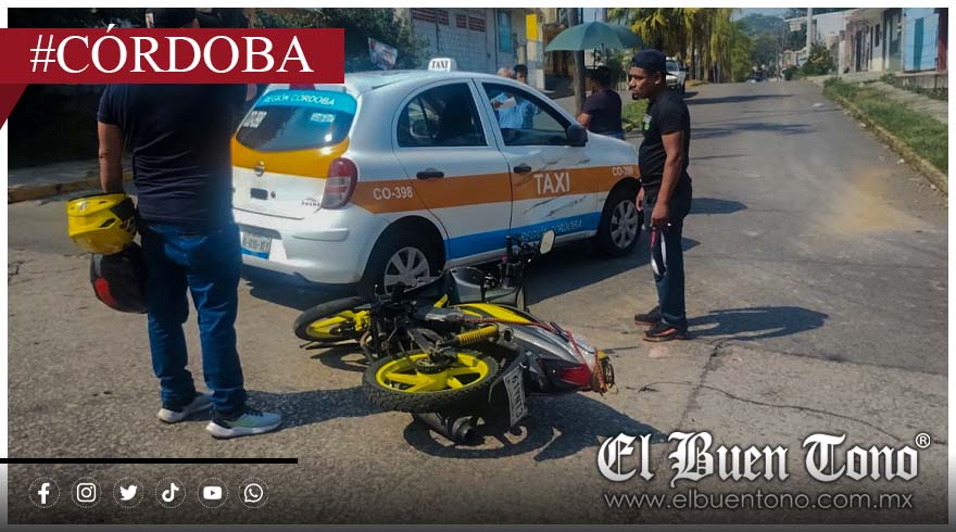 Córdoba.- Un choque entre un taxi de Córdoba marcado con el número CO-398 y un motociclista, ocurrió la tarde de este viernes la avenida 44 y calle 6, de la colonia Carriles. Paramédicos de la Cruz Roja le brindaron los primeros auxilios, y fue trasladado a un hospital para su atención médica.