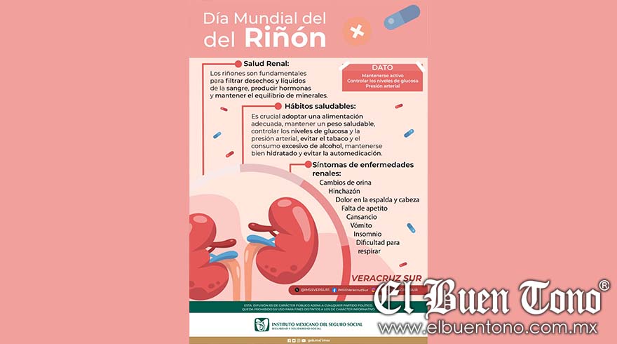 Región.- El Instituto Mexicano del Seguro Social (IMSS) en Veracruz Sur, invita a la población a fomentar y mantener estilos de vida saludable con el objetivo de prevenir enfermedades en los riñones, los cuales, de no funcionar correctamente pueden intoxicar el cuerpo del paciente llegando a ser letales para el mismo.