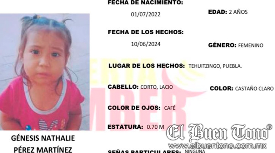 México.- La Alerta Amber ha sido activada en Puebla por la desaparición de Génesis Nathalie Pérez Martínez, una niña de 2 años que fue vista por última vez el 10 de junio de 2024 en el municipio de Tehuitzingo. La familia teme por su seguridad debido a la falta de información sobre su paradero.