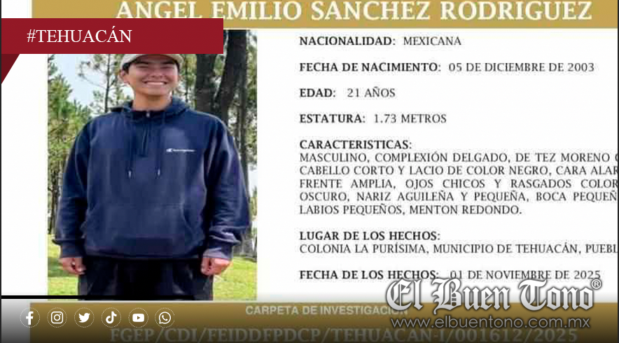 Tehuacán, Pue.— La Fiscalía General del Estado de Puebla activó una alerta de búsqueda por Ángel Emilio Sánchez Rodríguez, de 21 años, originario del municipio de Fortín y estudiante de sexto semestre de Medicina en la Benemérita Universidad Autónoma de Puebla (BUAP), sede Tehuacán.