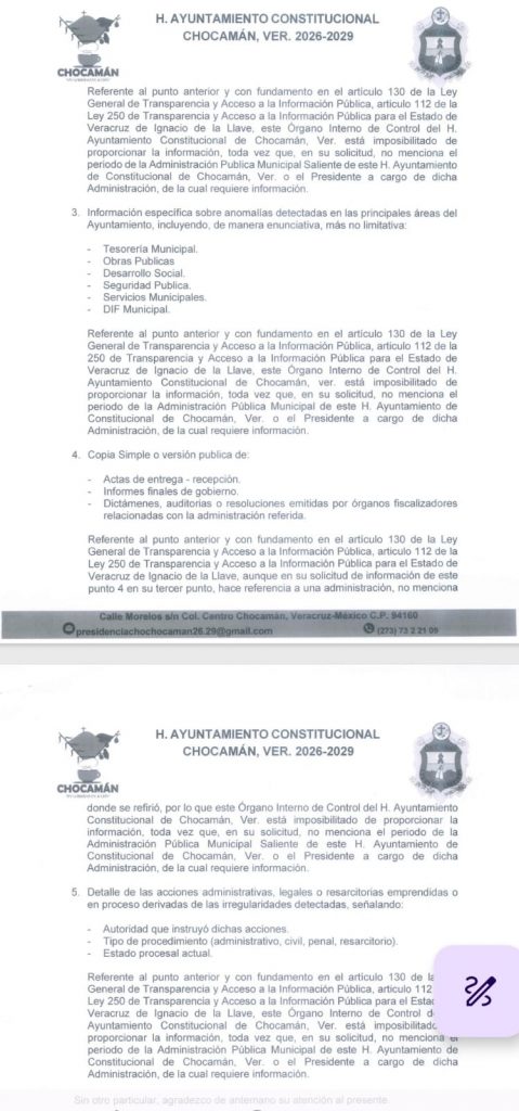 Chocamán, Ver.— El Ayuntamiento de Chocamán, encabezado por la presidenta municipal María Isabel Figueroa Luna, negó proporcionar información solicitada mediante un procedimiento de acceso a la información pública relacionada con irregularidades en la administración 2022–2025 del exalcalde Ernesto Ruiz García, lo que ha generado señalamientos de posibles acuerdos para encubrir actos de corrupción.