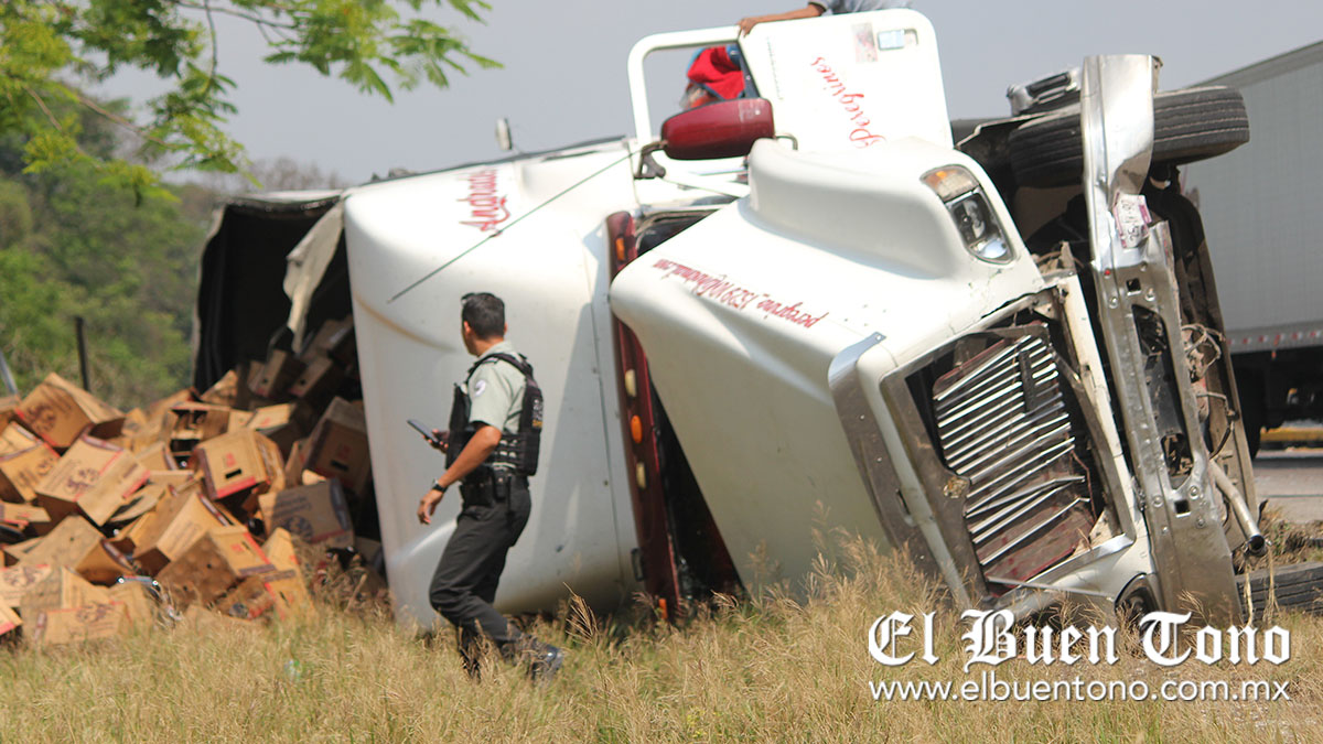Córdoba.- Volcado y con el cargamento de cerveza regado, es como terminó un tractocamión, sobre el kilómetro 293, lo que provocó la movilización de los grupos de auxilio además de autoridades de la Policía Estatal y Guardia Nacional.