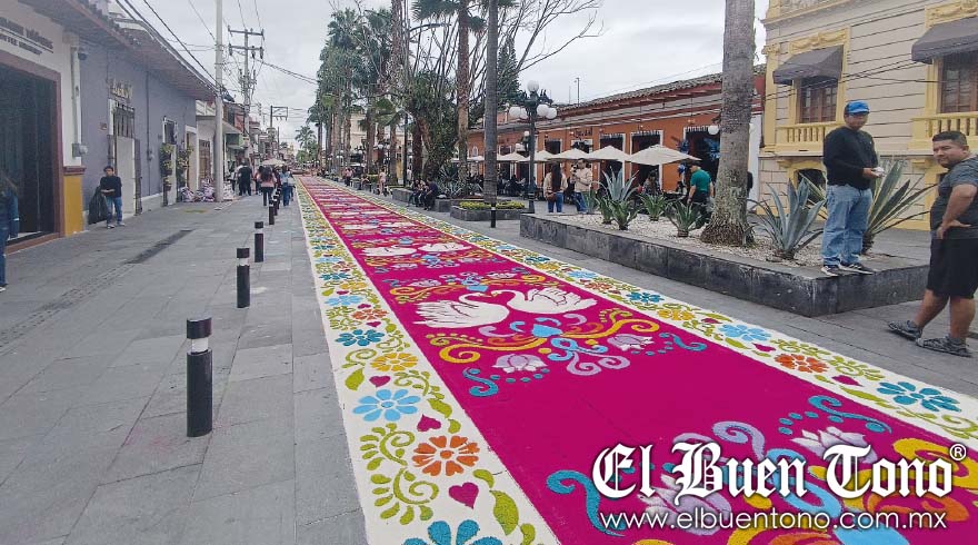 Orizaba.- Miles de ciudadanos de Orizaba y visitantes disfrutaron de la majestuosidad de los “700 metros, con siete estampados diferentes” de los tapetes de Huamantla, colocados desde el Paseo Colón hasta la Calle Madero.