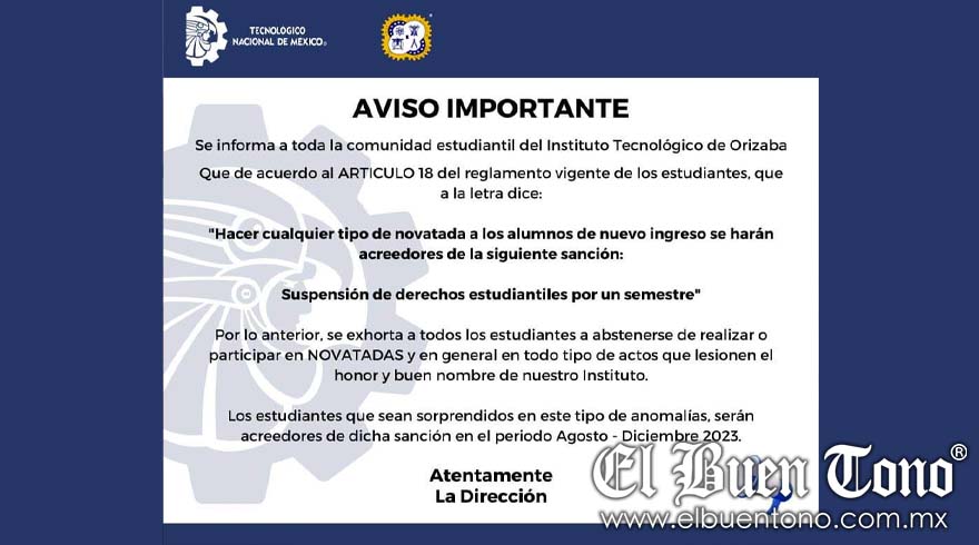 Orizaba. – Ante el inicio del semestre agosto-diciembre 2023, la dirección del Instituto Tecnológico Nacional de México, campus Orizaba, advirtió que aquellos que realicen novatadas serán castigados.