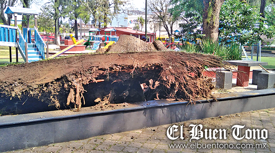 ORIZABA.- De manera aparatosa y debido a la surada que se registró desde las primeras horas de este martes fue derribado uno de los árboles que se encontraba en la Alameda Francisco Gabilondo Soler, esto en el área de juegos infantiles por lo que uno de los kioscos resultó seriamente dañado procediendo inmediatamente a su retirado.