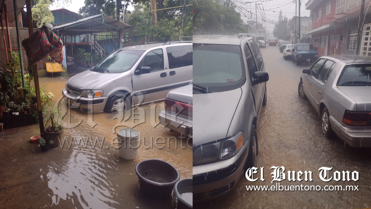Y es que derivado a la fuerte lluvia que cayó esta tarde de domingo, la cual duró alrededor de dos horas, dejó las calles inundadas.