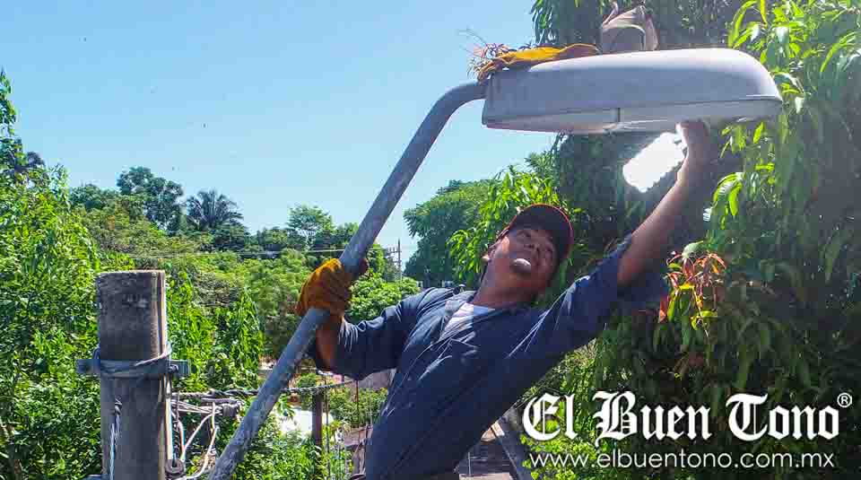 Omealca.- Por instrucciones de la alcaldesa, Nallely Cortés Jiménez, personal de Alumbrado Público otorga mantenimiento a luminarias que lo requieren en Bajo Grande, Benito Juárez, Callejón, Dos Caminos, El Jobo, La Balsa, Loma Mulato, Mata de Caña, y Palma Sola.