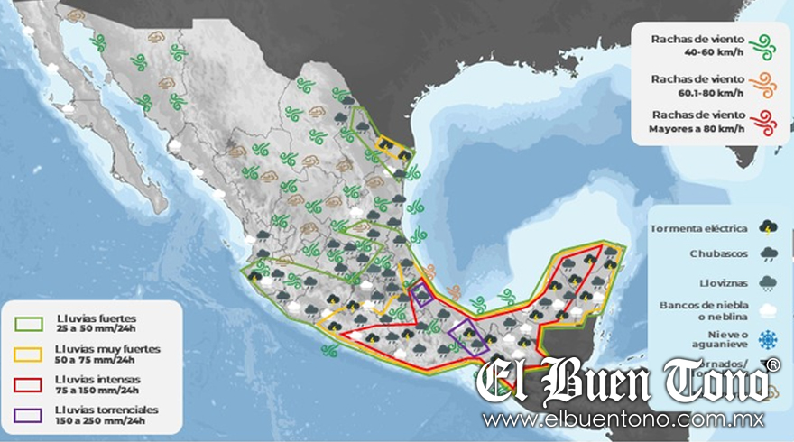 El SMN indicó que la entrada de humedad tanto del océano Pacífico como del golfo de México, sumada a la inestabilidad en niveles altos de la atmósfera, mantendrá activo el temporal de lluvias en gran parte del país. A pesar de las lluvias, se prevé un ambiente cálido a caluroso en estados del noroeste, noreste y occidente, con temperaturas extremadamente altas en Sonora y el noreste de Baja California.