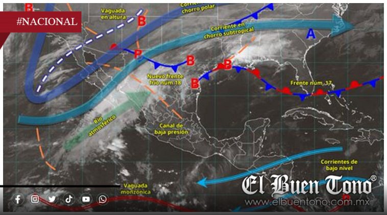 Nacional.- El Servicio Meteorológico Nacional informó que un nuevo sistema frontal impactará gran parte del territorio mexicano en los próximos días. Se trata del frente frío número 18, que recorrerá el norte y noreste del país mientras interactúa con una vaguada en altura y un río atmosférico, condiciones que provocarán un marcado descenso de temperatura, fuertes rachas de viento y precipitaciones intensas.