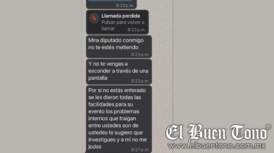 “Mira diputado conmigo no te estés metiendo, Y no te vengas a esconder a través de una pantalla…los problemas internos que traigan entre ustedes son de ustedes te sugiero que investigues y a mí no me jodas”, fueron las palabras que