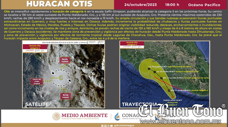 El presidente Andrés Manuel López Obrador emitió una alerta respecto al huracán Otis, que se prevé toque tierra entre Acapulco y Tecpan de Galeana con categoría 5. El presidente instó a la población a tomar medidas preventivas, como trasladarse a refugios y mantenerse en lugares seguros.