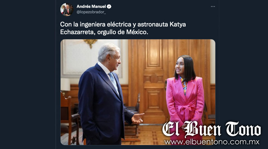 “Con la ingeniera eléctrica y astronauta Katya Echazarreta, orgullo de México”, dice un tuit desde la cuenta oficial del mandatario junto a una fotografía de ambos.