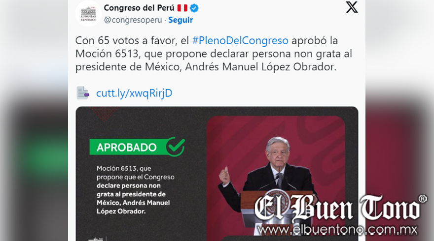El 25 de mayo de 2023, el Congreso de Perú aprobó la Moción 6513, declarando a AMLO “persona non grata” en respuesta a sus críticas contra la presidenta Dina Boluarte. La decisión fue tomada con 65 votos a favor, marcando un momento de tensión en la relación bilateral entre México y Perú. A pesar de la declaración, AMLO afirmó que consideraba un “timbre de orgullo” esta designación, reiterando su postura crítica hacia el gobierno peruano, especialmente en relación con la detención del expresidente Pedro Castillo.