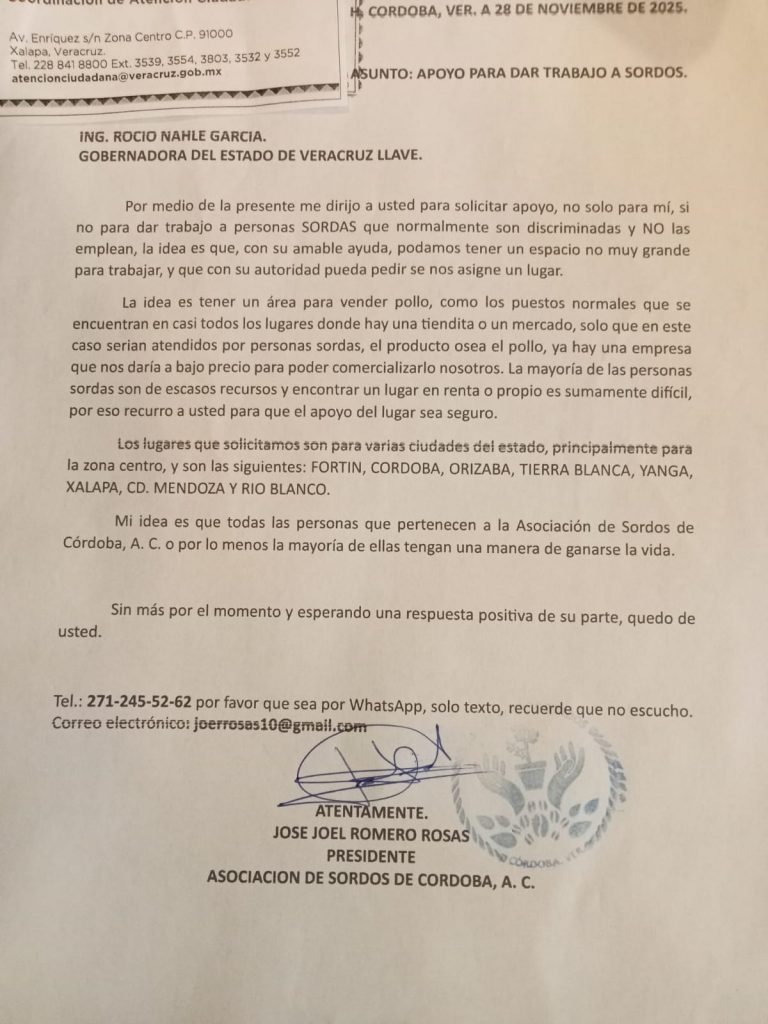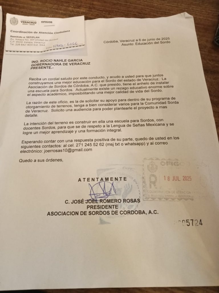 José Joel Romero Rosas, presidente de la Asociación de Sordos de Córdoba, A.C., envió dos oficios a la gobernadora Rocío Nahle García, solicitando apoyo urgente en dos rubros críticos: la generación de empleo y el acceso a una educación especializada.