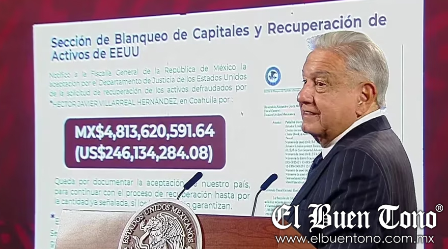 CDMX.- Andrés Manuel López Obrador (AMLO), presidente de México anunció que poco más de 246 millones de dólares serán devueltos a las arcas públicas de México por parte de los Estados Unidos, presumió como una buena noticia la resolución del Departamento de Justicia en el caso de defraudación realizado por Héctor Javier Villarreal Hernández, exfuncionario durante la administración de Humberto Moreira en Coahuila.