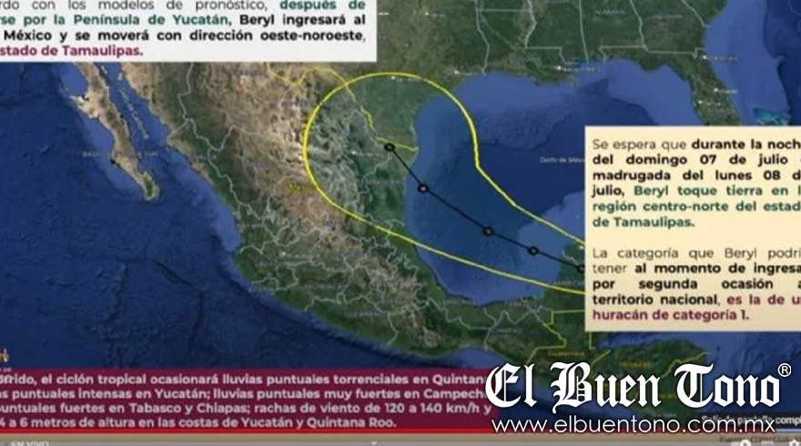 “Se espera que durante la noche del 7 de julio o la madrugada del lunes 8 de julio este huracán ‘Beryl’ toque tierra nuevamente en la región norte del estado de Tamaulipas. La categoría que ‘Beryl’ podría tener al momento en este segundo ingreso es de categoría 1”, afirmó Velázquez.