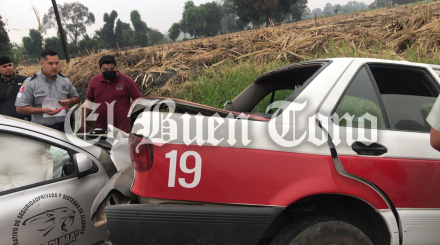 Yanga.- Cuatro personas lesionadas, movilización de los grupos de auxilio así como también de los oficiales de la Guardia Nacional, fue lo que dejó esta mañana de miércoles el aparatoso choque entre un vehículo Nissan March con razón social a nombre de Corporativo de Seguridad Privada y Sistemas de Alarmas “El Puma” y el taxi marcado con el número 19 del municipio de Atoyac, debido a que presuntamente el conductor del taxi al realizar un corte de circulación, provocó el aparatoso accidente en el kilómetro 20 de la carretera federal Córdoba-Cuitláhuac en la comunidad de Palmillas.