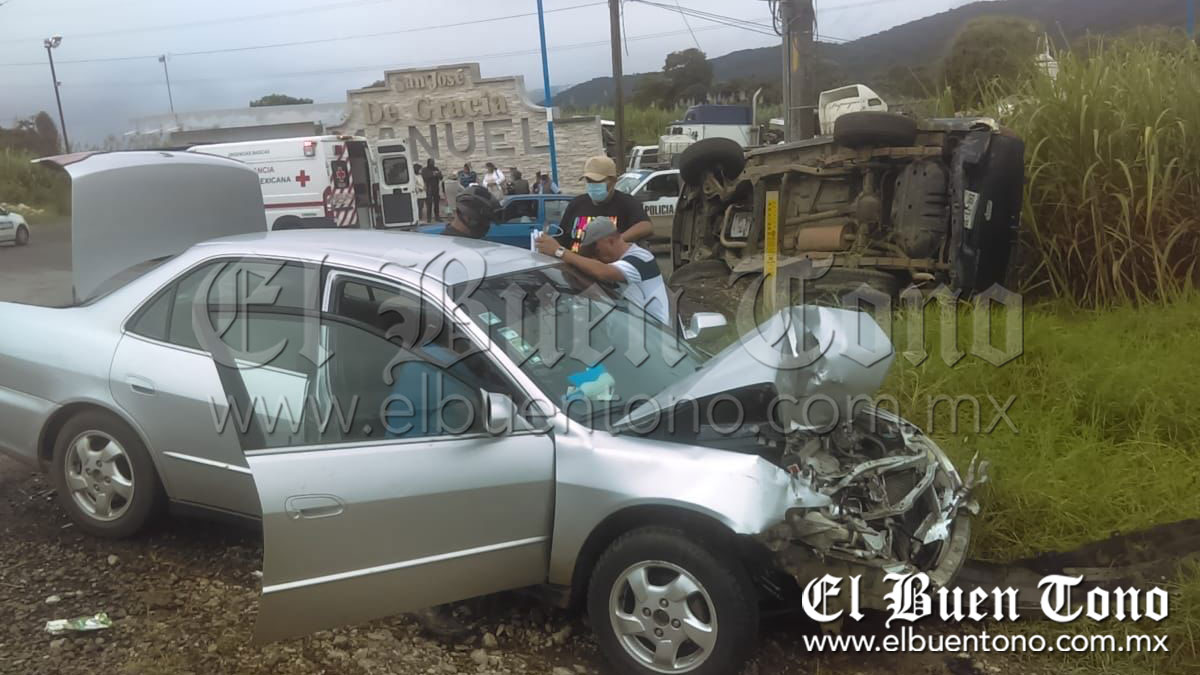 Amatlán, Ver.- Cuatro personas lesionadas entre ellas un menor de edad, fue lo que dejó el aparatoso choque y volcadura entre una camioneta Chevrolet-Blazzer y un vehículo Honda, la mañana de este martes además de la movilización de los grupos de auxilio así como también de la Policía Municipal y Guardia Nacional, al accidentarse sobre la carretera federal Córdoba-Cuitláhuac a la altura de la entrada a la comunidad de Manuel Leon.