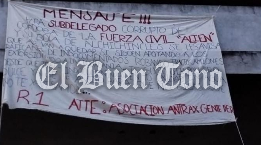 Fue cerca de las 05:00 horas, cuando los automovilistas se percataron de dicho mensaje, el cual es de un grupo delectivo, y en ese escrito se menciona al delegado Alan René, del distintivo “Alien” es como se conoce al subdelegado de la Fuerza Civil de esta ciudad, el cual fue exhibido y amenazado, ya que fue señalado por apoyar a traficantes de indocumentados, roba tráilers y de ser uno de los tantos elementos de la Fuerza Civil que roban y extorsionan a los ciudadanos, al igual es señalado por detener a gente, plantarles cosas y ponerlos a disposición.