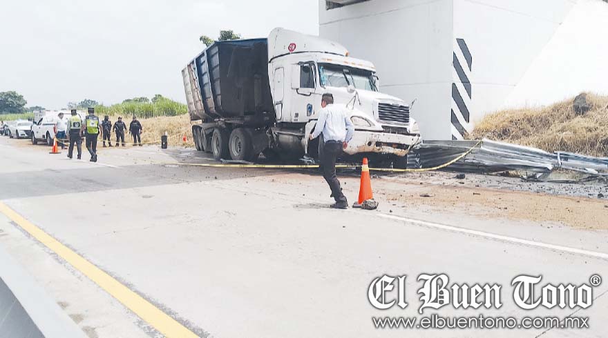 Este accidente ocurrió a las 11:30 horas, al momento en que un tractocamión, placa de circulación 61A713, con tolva vacía, sin razón social, circulaba a velocidad inmoderada con dirección a Veracruz.