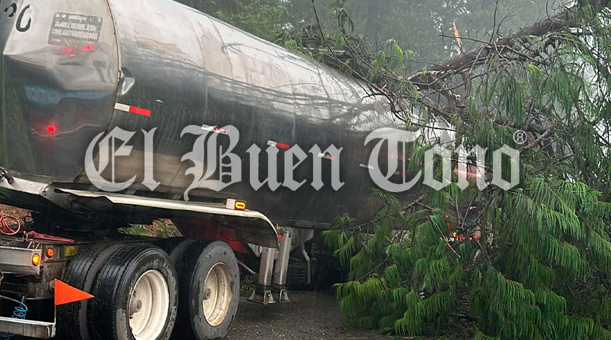 Este fenómeno natural ocasionó que un árbol de gran tamaño cayera encima de un tractocamión acoplado a dos pipas, por fortuna el conductor salió ileso.
