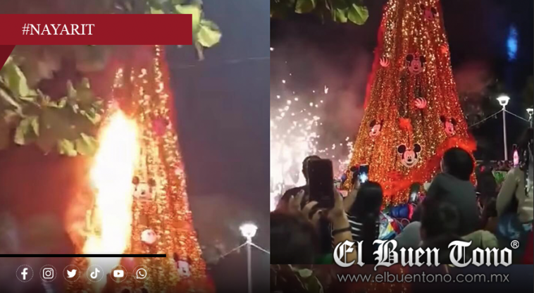 San Vicente, Bahía de Banderas, Nayarit.— Lo que debía ser un momento de alegría y expectativa para la comunidad se convirtió en susto cuando, durante el encendido del árbol navideño de San Vicente, una chispa de la pirotecnia alcanzó la estructura y provocó que se incendiara casi de inmediato.