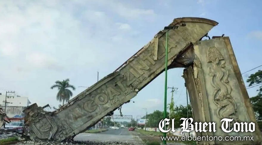 Veracruz.- La mañana de hoy se desplomó el arco de entrada al municipio de Coatzintla, los habitantes del municipio ya habían denunciado el mal estado de esta obra, fue por las fuertes lluvias que terminó por colapsar.
