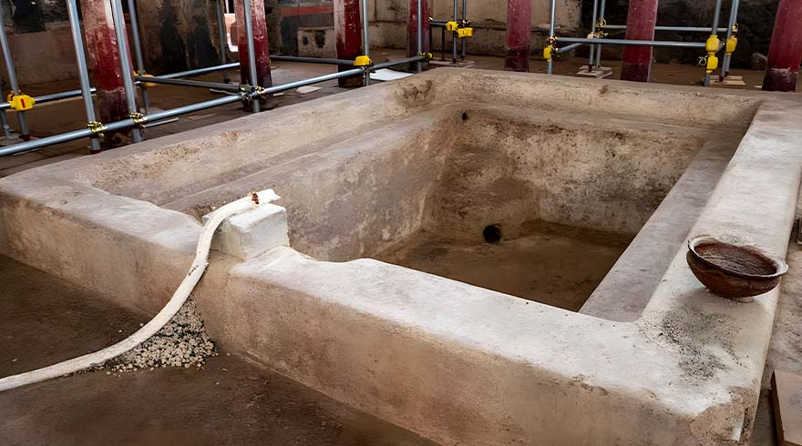 El complejo de baños forma parte de una mansión perteneciente probablemente a Aulus Rustius Verus, un político adinerado de la ciudad. Entre los hallazgos más impactantes, destacan los restos de dos personas que perecieron durante la erupción. Un hombre joven y una mujer, que portaban joyas y monedas de oro, fueron hallados en una pequeña habitación, víctimas de la fuerza del flujo piroclástico. Este trágico descubrimiento muestra el contraste entre la opulencia de la élite y las condiciones extremas de los esclavos que mantenían el complejo en funcionamiento.