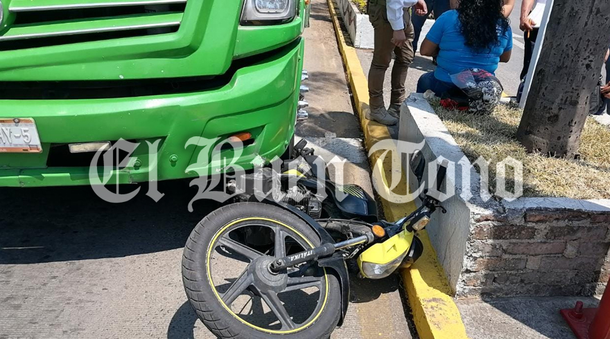 Río Blanco.- Con una lesión en la pierna derecha resultó una motociclista, quien al ir circulando sobre el bulevar de la avenida Veracruz, fue arrollada por el conductor de un autobús de la línea Metropolitanos, justo a la altura del semáforo que está enfrente del Palacio Municipal.