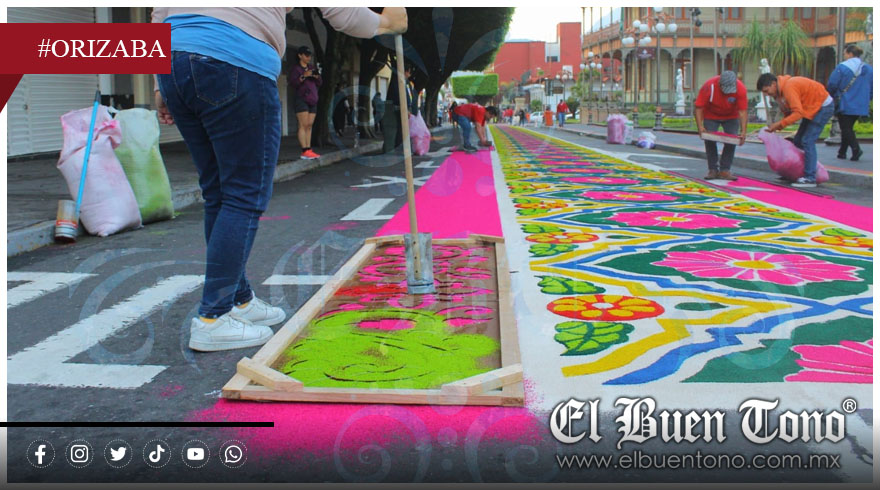 Desde las primeras horas, bajo la dirección del maestro Efren Chacón, los artesanos trabajaron con paciencia y devoción en la colocación de alfombras multicolores que recorren la Avenida Colón, desde Sur 10 hacia Madero, y culminan frente al Palacio de Hierro, pasando por la Catedral de San Miguel Arcángel. Un espectáculo que los orizabeños esperan con entusiasmo cada año.