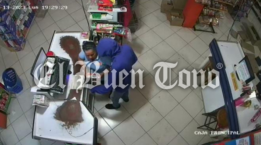 Las cámaras de videovigilancia captaron el momento del robo, el cual ocurrió la noche del lunes; el asaltante, a pesar de que hay clientes, amaga a la cajera y huye con todatranquilidad.
