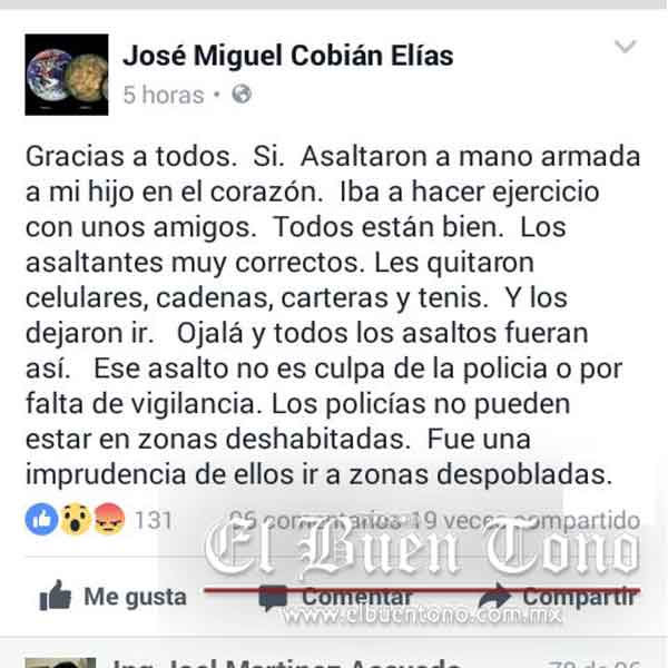 En su cuenta de Facebook, Cobián Elías mencionó que los asaltantes fueron considerados al no haber dañado la integridad de su hijo, asimismo, culpó a los jóvenes de haber acudido a realizar ejercicio a un lugar despoblado y sin vigilancia.