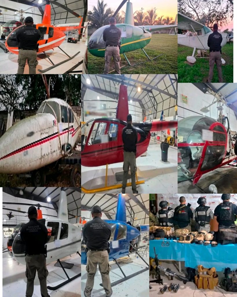 En el inmueble cateado, que era utilizado de manera ilegal como helipuerto, las autoridades aseguraron seis aeronaves de ala rotativa (helicópteros), una aeronave de ala fija, un fuselaje y un vehículo, lo que representa un golpe significativo a las operaciones aéreas clandestinas en la región.
