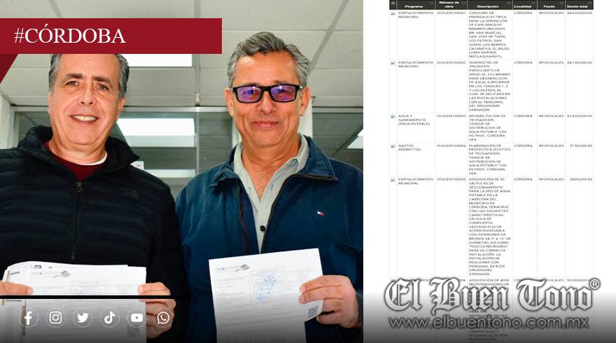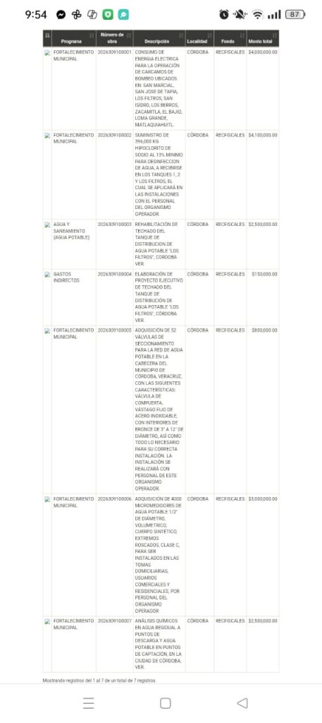 Según el Sistema de Consulta de Obras y Acciones Municipales del Órgano de Fiscalización Superior del Estado (ORFIS), el organismo operador ha registrado siete contrataciones para 2026, todas con cargo al fondo de Recursos Fiscales, que suman más de 17 millones de pesos. La mayor parte se concentra en insumos para mantener la operación cotidiana: 4.1 millones para hipoclorito de sodio (cloro), 4 millones para energía eléctrica de cárcamos de bombeo, 3 millones para 4 mil micromedidores y 800 mil pesos en válvulas de seccionamiento. También se contemplan 2.5 millones para análisis químicos de agua residual y potable, y 2.5 millones para rehabilitar el techado del tanque de distribución “Los Filtros”, más 150 mil pesos para el proyecto ejecutivo de esa misma obra.