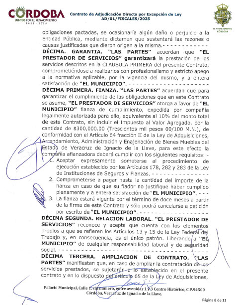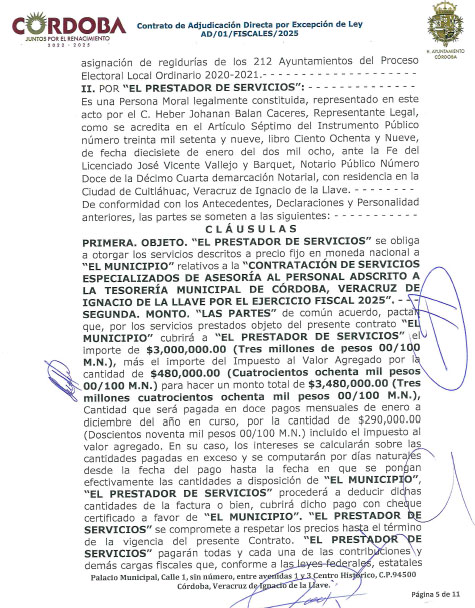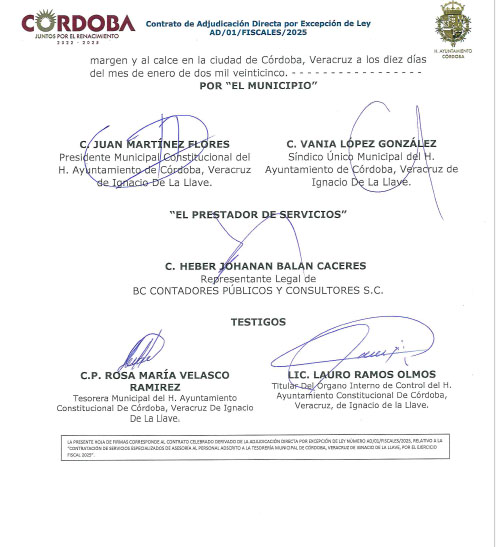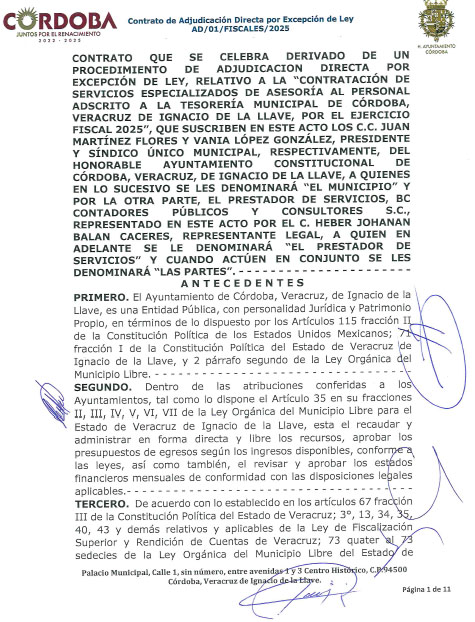 Córdoba, Ver.- De cara a su fin de administración, el Ayuntamiento de Córdoba, Veracruz, que preside Juan Martínez Flores y que cuenta con Vania López González como Síndica Única Municipal, ha formalizado en los últimos meses de su administración una serie de contratos por servicios especializados por un monto total que supera los siete millones de pesos, evadiendo los procesos de licitación pública mediante la figura de la “Adjudicación Directa por Excepción de Ley”.