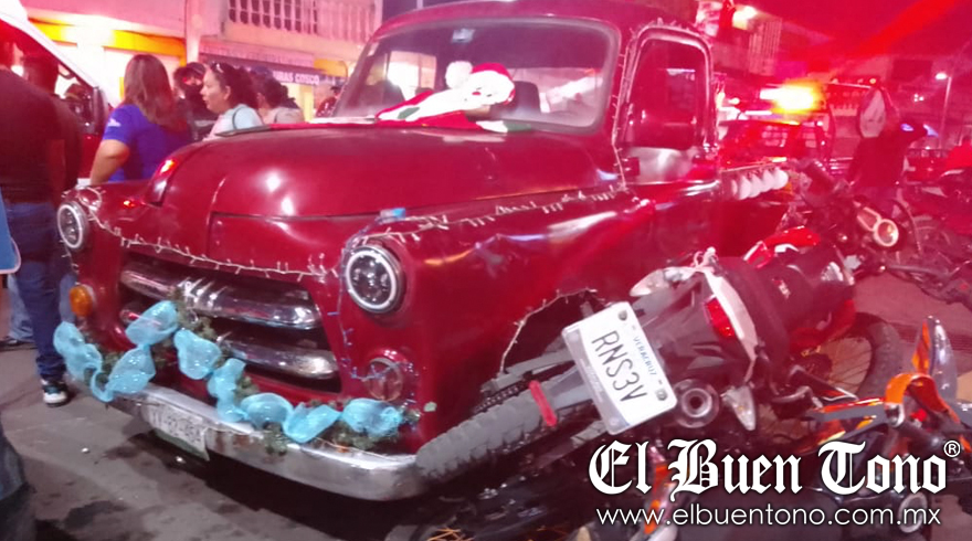 Fortín.- Una camioneta que participaba en un desfile navideño, se quedó sin frenos y provocó una carambola al chocar contra tres vehículos y  dos motocicletas, dejando saldo de siete personas lesionadas, durante la noche de ayer en la calle 1 entre las avenidas 1 y 2.
