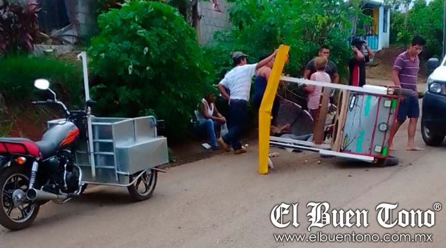 En ese momento, el conductor de la camioneta blanca de la empresa Truper, chocó contra los comerciantes cuando intentó rebasarlos y provocó que el mototriciclo volcara.