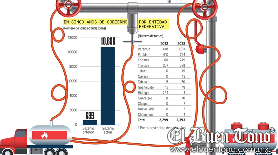 Nacional.- Petróleos Mexicanos (Pemex) y el gobierno federal han enfrentado un desafío persistente en su lucha contra el robo de gas LP, que continúa siendo uno de los principales objetivos del crimen organizado. Según datos recopilados desde diciembre de 2018 hasta noviembre de 2023, se ha registrado un récord alarmante en la cantidad de tomas clandestinas, alcanzando un acumulado de 10 mil 696.