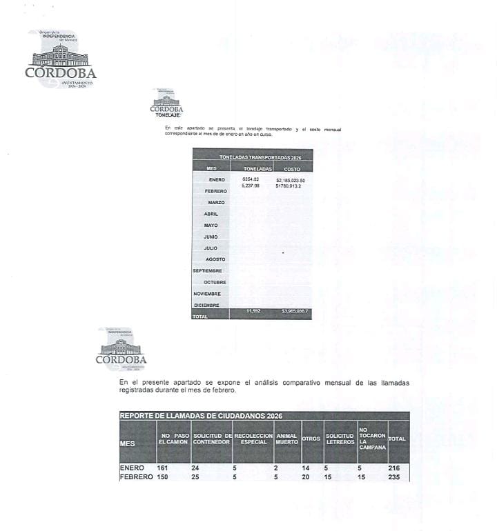 El reporte mensual de llamadas, firmado por el jefe de Limpia Pública, Heriberto Mendoza Islas, contabilizó 235 reportes durante febrero, frente a 216 en enero. El rubro “No pasó eliminado”, que agrupa las quejas por recolección fallida, sumó 150 llamadas en febrero, lo que equivale a 5.3 reportes diarios. Es decir, cada día cinco hogares cordobeses invirtieron tiempo en notificar que el servicio municipal no llegó. A esto se suman aumentos en reportes por animales muertos (de 2 a 5) y en la categoría “Otros” (de 14 a 20), lo que confirma un deterioro en la atención de necesidades básicas.