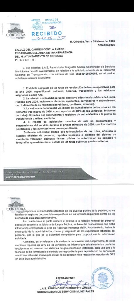 Los documentos obtenidos vía transparencia revelan que la Coordinación de Servicios Municipales, a cargo de René Moshe Burguette Ameca, y la Jefatura de Protección Ambiental, encabezada por Tayde Elizabeth González López, enfrentan cuestionamientos que vienen del año anterior. Durante 2025, diversas solicitudes de información ya habían señalado la falta de permisos ambientales para operar el centro de transferencia de residuos sólidos del municipio.