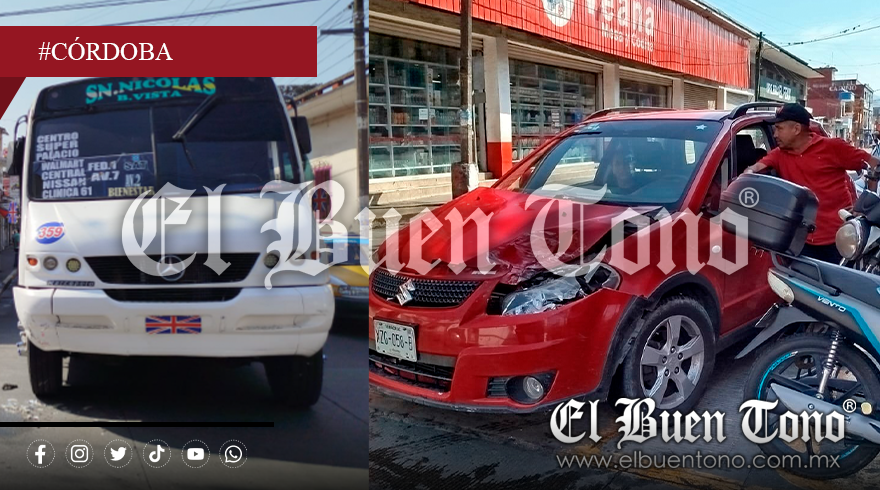 Córdoba, Ver.- Un aparatoso choque entre un automóvil particular y un autobús de transporte público se registró la tarde de este miércoles en la intersección de la avenida 2 y calle 15, en pleno centro de la ciudad. Por fortuna, no se reportaron personas lesionadas.