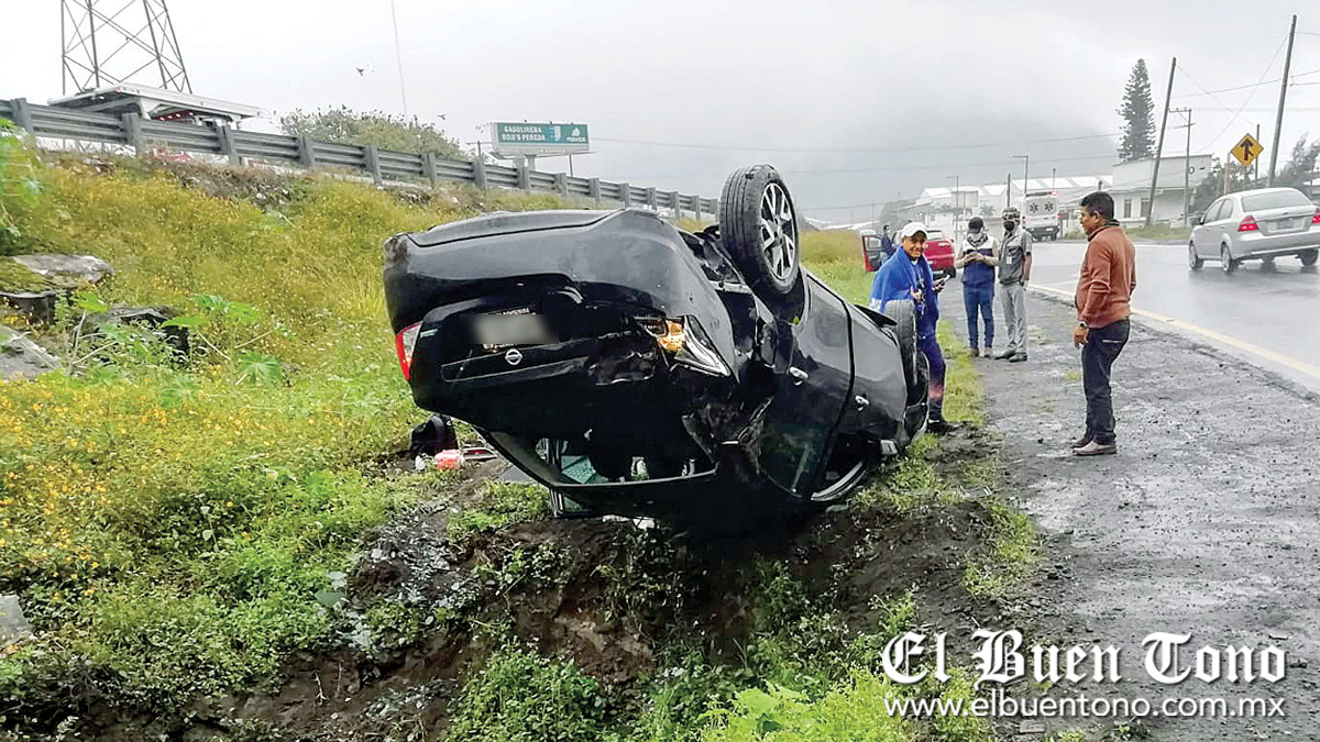 RÍO BLANCO.- Una persona parcialmente lesionada y daños materiales valuados en algunos miles de pesos fue el saldo de la volcadura de un automóvil particular, registrada en el kilómetro 268, a la altura de la Comisaría de Sector de la Guardia Nacional, División de Caminos; el conductor perdió el control del volante y prácticamente la unidad salió “disparada” hacia el acotamiento, volcada sobre un área verde con las llantas hacia arriba.