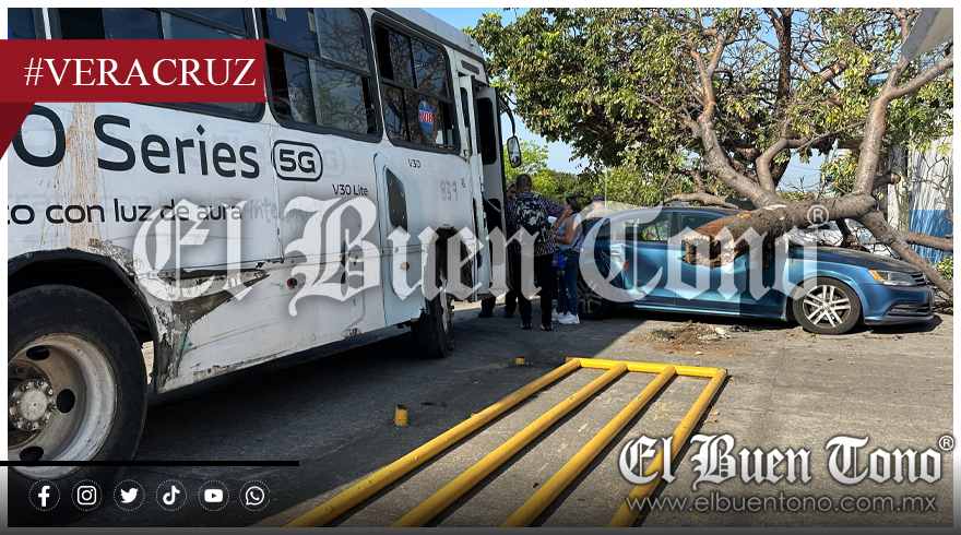 Veracruz, Ver.- Un autobús de pasaje de la ruta Comercial Mexicana chocó contra el barandal de la escuela Constanza Condes de la Torre, debido al impacto tiró un árbol que destrozó a un automóvil estacionado, dejando severos daños materiales.