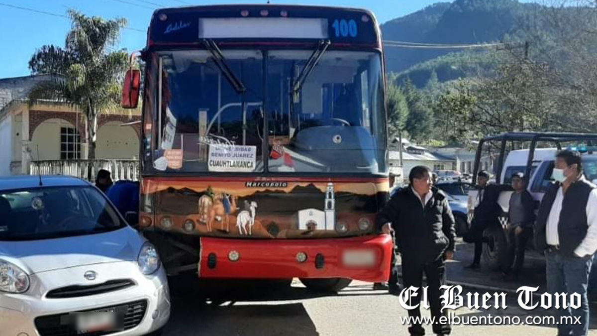 Al llegar a la desviación que va hacia la localidad de Zacamilola, el operador de la unidad de transporte público, Adelas, marcada con el número económico 100, perdió el control del volante y le hizo corte de circulación al auto compacto.