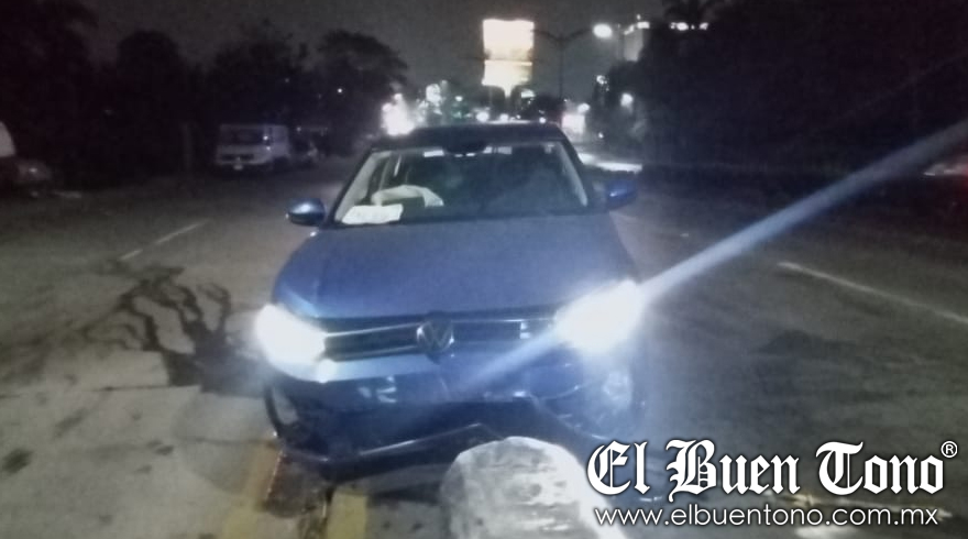 Córdoba, Ver.- Daños materiales y el cierre de la circulación en un carril, dejó como saldo un accidente registrado esta noche, luego de que el conductor de un vehículo particular perdiera el control y chocara contra un muro del puente de plaza cristal. Al lugar llegaron autoridades policiacas y peritos de tránsito municipal para tomar conocimiento y realizar el deslinde de responsabilidades. El conductor dejo la unidad encendida y se retiró del lugar para evitar ser detenido.