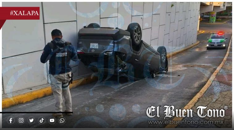 Xalapa, Ver.- Un automóvil volcó sobre Circuito Presidentes, en la esquina con la avenida Murillo Vidal, luego de que presuntamente impactara contra la barda del puente elevado.